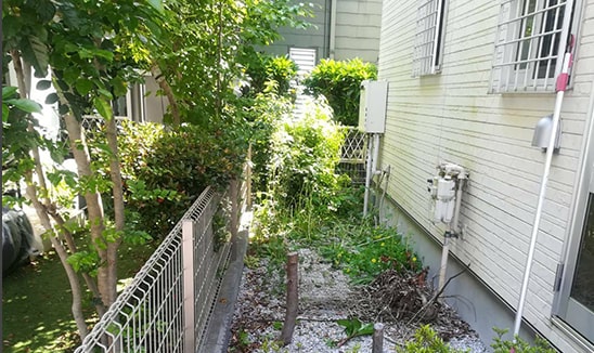 お庭に生い茂った雑草を刈り、整地、敷砂利いたしました。